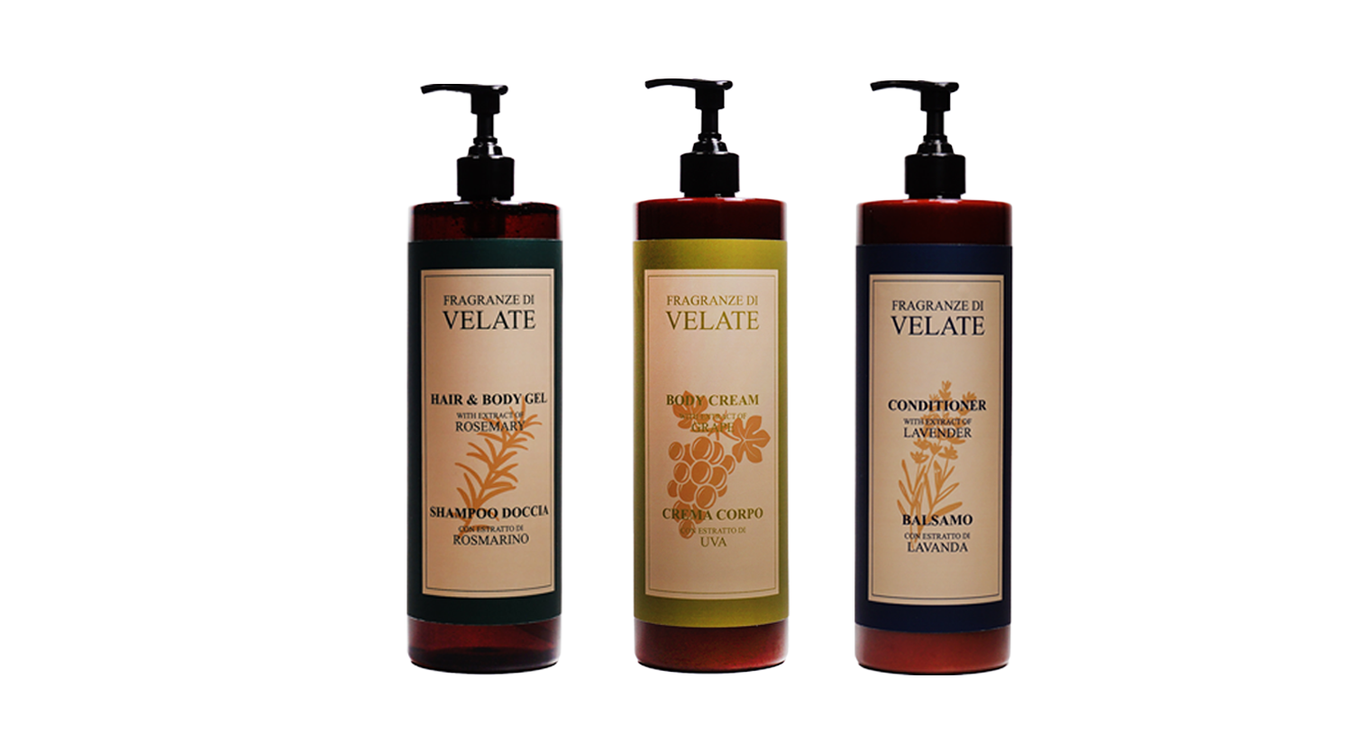 300 ml bottles for our lovely hotel line enriched with herbs, flowers and fruits that grow in Velate in Italy